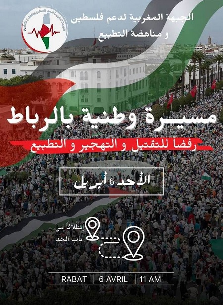 دعت الجبهة المغربية لدعم فلسطين ومناهضة التطبيع لمسيرة وطنية بالرباط رفضا للتقتيل والتهجير والتطبيع يوم الأحد 6 أبريل 2025.