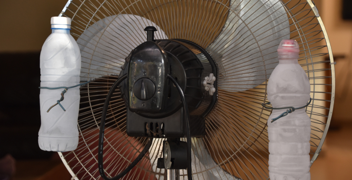 كما بإمكانك صنع مكيف هواء مؤقت عن طريق وضع وعاء كبير من الثلج أمام المروحة أو من خلال تعليق عبوتين من الماء المجمد على الطرف الخلفي من المروحة لتزيد من نسبة برودة الهواء.