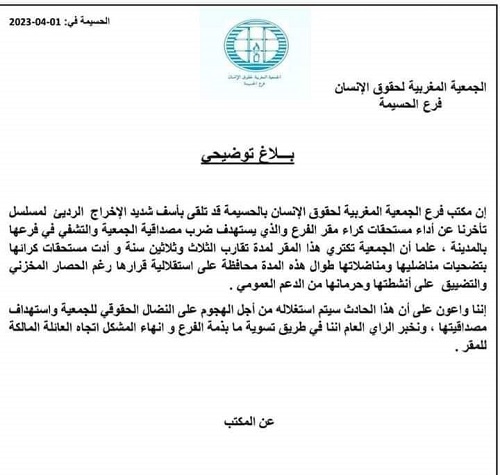 وقال الفرع في بيان له “إن مكتب فرع الجمعية المغربية لحقوق الإنسان بالحسيمة قد  تلقى بأسف شديد الإخراج الرديئ لمسلسل تأخرنا عن أداء مستحقات كراء مقر الفرع والذي يستهدف ضرب مصداقية الجمعية والتشفي في فرعها بالمدينة، علما أن الجمعية تكتري هذا المقر لمدة تقارب الثلاث وثلاثين سنة وأدت مستحقات كرائها بتضحيات مناضليها ومناضلاتها طوال هذه المدة محافظة على استقلالية قرارها رغم الحصار المخزني والتضييق على أنشطتها وحرمانها من الدعم العمومي”.