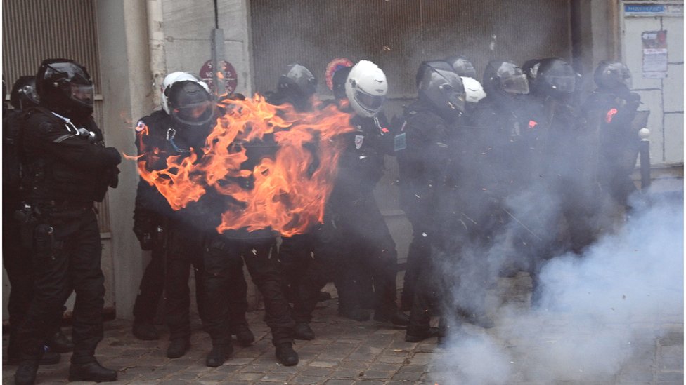 اندلعت اشتباكات عنيفة بين المتظاهرين والشرطة الفرنسية بباريس وعدة مدن أخرى، على خلفية رفض الجمعية الوطنية الفرنسية تصويتين على حجب الثقة عن الحكومة بسبب قانون إصلاح نظام التقاعد.
