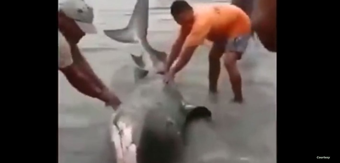 يظهر في الفيديو أشخاص متجمعين حول حوت جانح على الشاطئ وبعضهم يحاول إرجاعه إلى الماء.