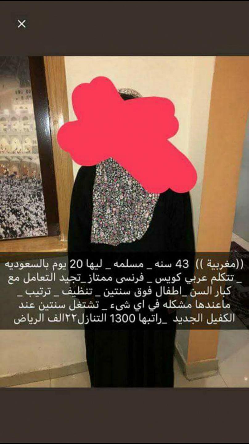 فقد نشرت العديد من الصفحات السعودية بموقع “تويتر”، صورة إعلان، يظهر رغبة سعودي في التنازل عن خادمته التي تحمل الجنسية المغربية مقابل مبلغ مالي.