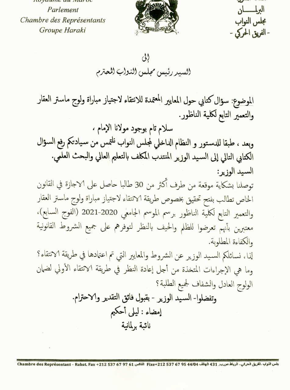 وأشارت النائبة المذكورة في معرض سؤالها، أنها توصلت بشكاية موقعة من طرف أكثر من 30 طالبا حاصل على الإجازة في القانون الخاص تطالب بفتح تحقيق بخصوص طريقة الانتقاء لاجتياز مباراة ولوج ماستر العقار والتعمير التابع لكلية “سلوان” بالناظور، برسم الموسم الجامعي 2020-2021، الخاص بالفوج السابع، معتبرين (الطلبة)، أنهم تعرضوا للظلم والحيف بالنظر لتوفرهم على جميع الشروط القانونية والكفاءة المطلوبة.