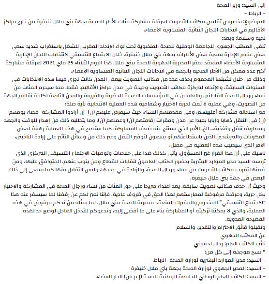 وجه المكتب الجهوي للجامعة الوطنية للصحة، مراسلة إلى وزير الصحة بخصوص تقليص مكاتب التصويت، مشيرا إلى سعي بعض عناصر الإدارة بمعية بعض الأطراف بجهة بني ملال خنيفرة لعرقلة مشاركة مئات الأطر الصحية بجهة بني ملال خنيفرة من خارج مراكز الأقاليم في انتخابات اللجان الثنائية المتساوية الأعضاء.