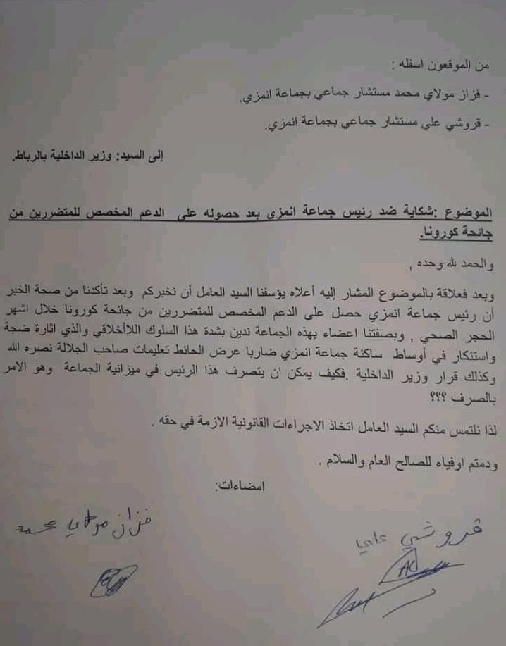 ووجّه مستشاران جماعيان في جماعة “أنمزي” في الإقليم ذاته بشكاية إلى وزير الداخلية ضد رئيس الجماعة المذكورة، بعد ثبوت استفادته، عن طريق التدليس، من دعم “صندوق كورونا”.