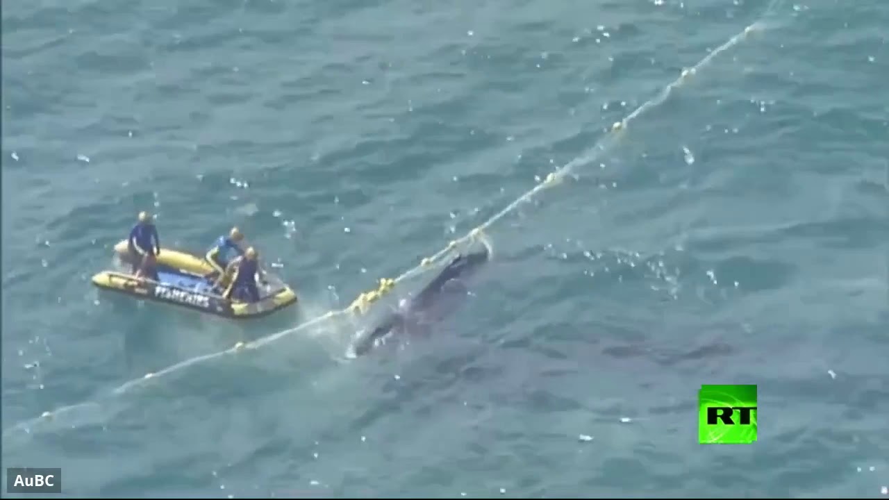 فيديو.. أم حوت تحنو على صغيرها وتتلهف ليتمكن المنقذون من تحريره من شباك الصيد في أسرع وقت