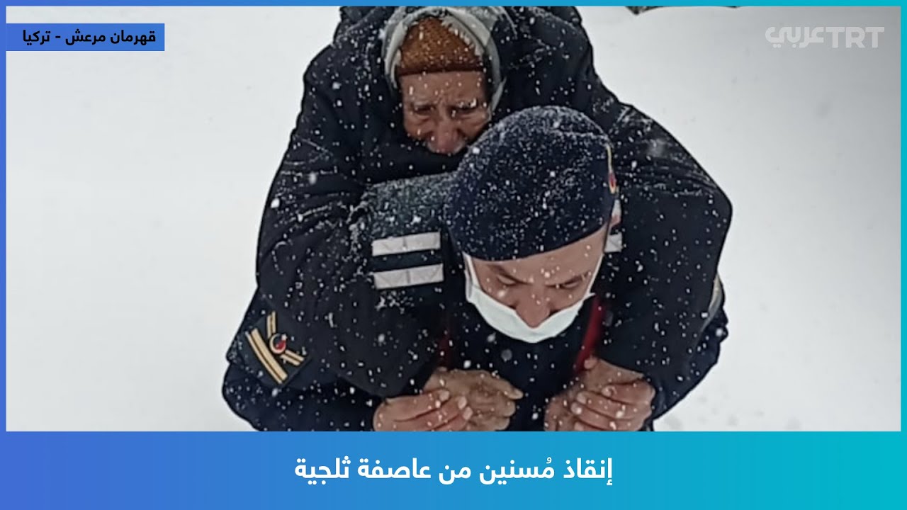 حملوهم على ظهورهم.. مقطع فيديو يظهر عناصر من قوات الدرك التركي يُخْلون زوجين مُسنين كان منزلهما على وشك الانهيار بسبب العواصف الثلجية بولاية قهرمان مرعش جنوب تركيا.