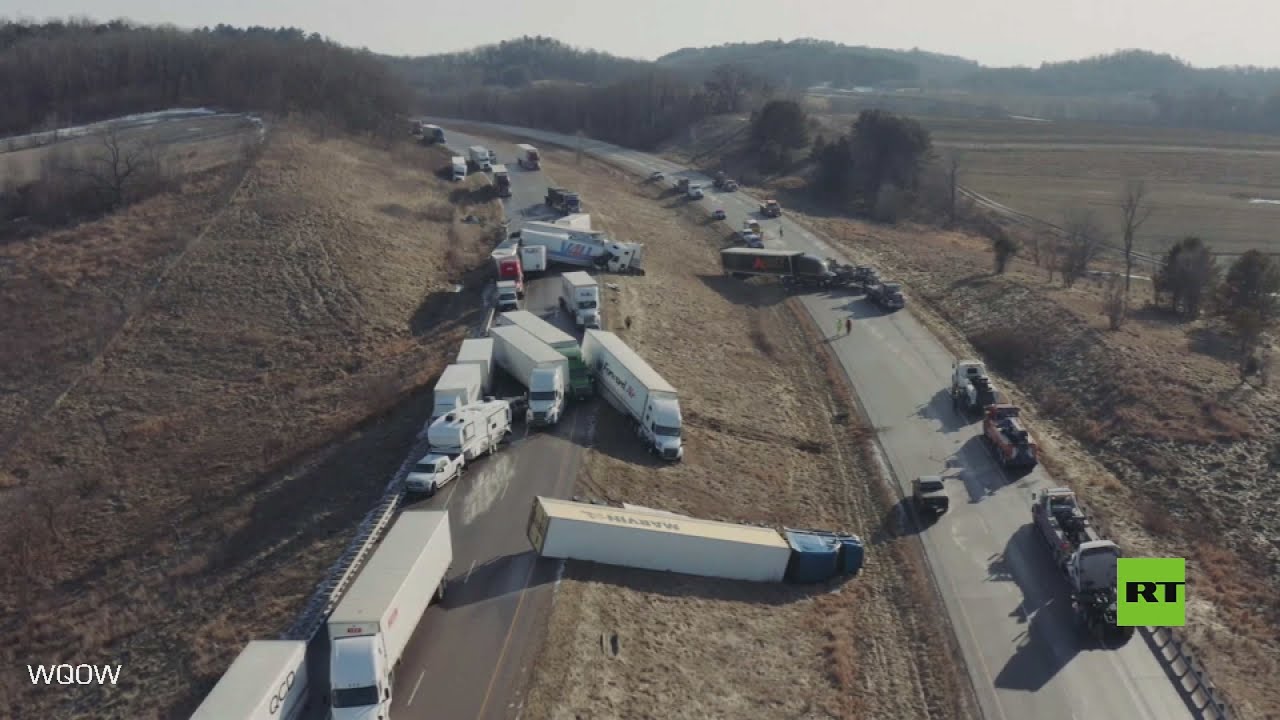 تسبب تشكل الجليد على أحد الطرق السريعة في ولاية ويسكونسن الأمريكية بوقوع حوادث سير لعدد كبير من السيارات والشاحنات.
