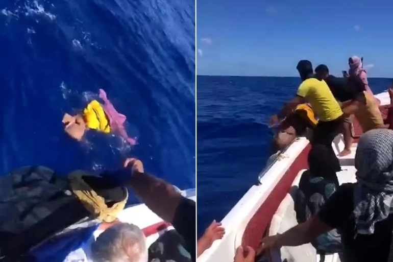 ووثق المقطع لحظات عصيبة وفاجعة كبيرة وفق وصف المغردين، حيث كفّن الأب بملابسه جثة ابنه، وسط صدمة وفزع بقية الركاب على متن قارب الهجرة.