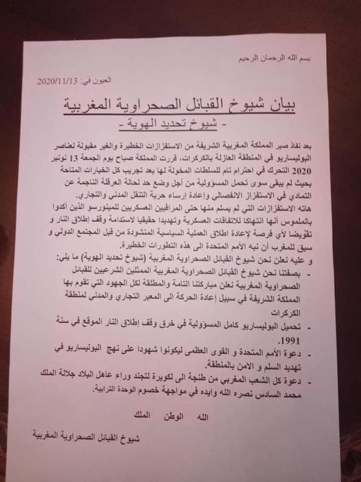 أعلن شيوخ القبائل الصحراوية المغربية، في بلاغ رسمي مساء اليوم الجمعة، أطلق عليه اسم “شيوخ تحديد الهوية”، مباركتهم التامة والمطلقة “لكل الجهود التي تقوم بها المملكة الشريفة في سبيل إعادة الحركة بالمعبر التجاري الكركرات”.
