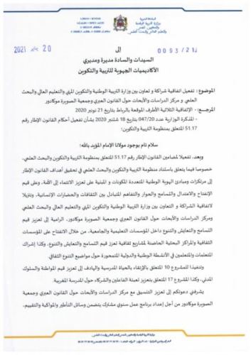 وجاءت دعوة أمزازي، في رسالة بعثها إلى المديريات الجهوية للتربية والتكوين، تنزيلا “لاتفاقية الشراكة والتعاون بين وزارة التربية الوطنية والتكوين المهني والتعليم العالي والبحث العلمي ومركز الدراسات والأبحاث حول القانون العبري وجمعية الصويرة موكادور”.