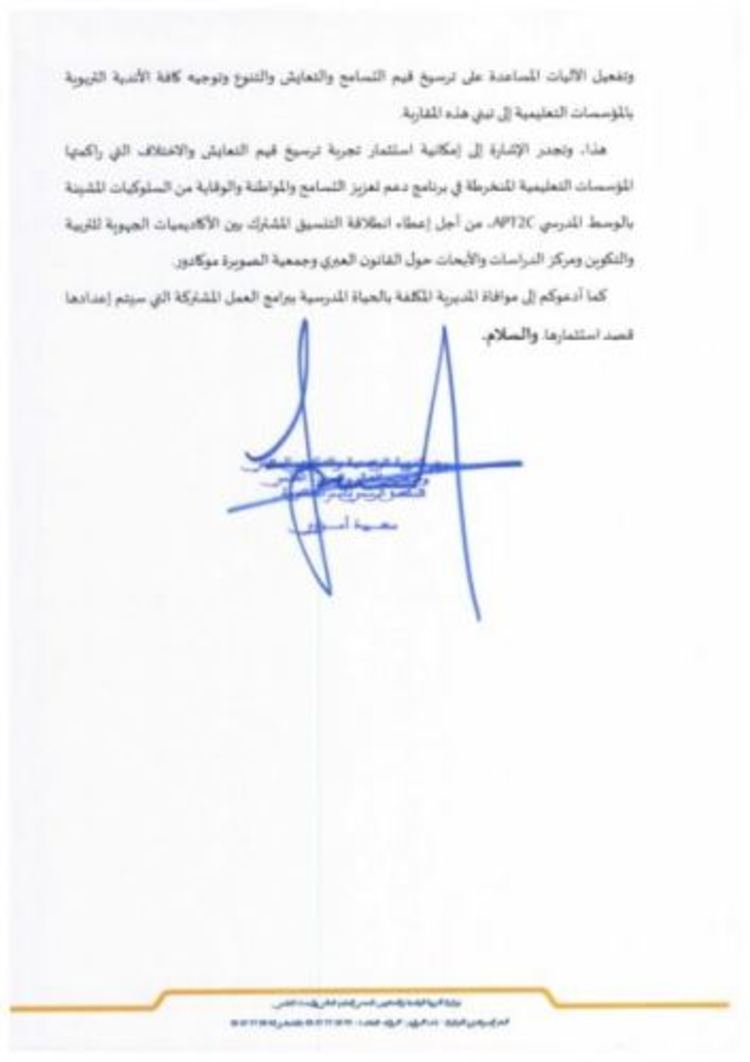 وذلك من أجل “تفعيل مضامين القانون الإطار رقم 51.17 المتعلق بمنظومة التربية والتكوين والبحث العلمي”؛ يضيف المصدر نفسه، خصوصا “فيما يتعلق باستناد منظومة التربية والتكوين والبحث العلمي في تحقيق أهداف القانون الإطار، إلى مرتكزات ومبادئ الهوية الوطنية المتعددة المكونات والمبنية على تعزيز الانتماء إلى الأمة”، وعلى قيم الانفتاح والاعتدال والتسامح والحوار والتفاهم المتبادل بين الثقافات والحضارات الإنسانية”. وكذا “إشراك المتعلمات والمتعلمين في الأنشطة الوطنية والدولية المتمحورة حول مواضيع التنوع الثقافي”.