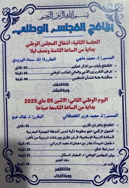 نظم المكتب الوطني للجمعية المغربية لأساتذة التربية الإسلامية مجلسه الوطني الأول وندوة وطنية تحت عنوان “التربية الإسلامية: تحديات الحاضر ورهانات المستقبل” بمدينة المحمدية، انطلق اليوم الأحد 04 ماي ويستمر غدا الاثنين 05 ماي 2025.