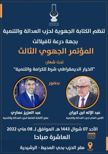 وجاء، في ذات الإعلان. أن المؤتمر الجهوي سيعقد يوم الأحد 8 ماي، بمقر الحزب بحي المحيط- الرشيدية.