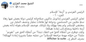 وتساءل الفزازي، في ذات المقال، بالقول “أما كان الأولُ والأولى لماكرون أن بهتمّ بأزمات بلاده؟”، مضيفا،  أن “فرنسا تعيش أزمات على كلّ صعيد. أزمتها اللغوية كارثية فقد بات البحث العلمي المعمق داخل فرنسا نفسها بالأنجليزية. وجل التلاميذ في الابتدائي والإعدادي لا يفقهون شيئاً في قواعد النحو والصرف والإملاء وهم فرنسيون أباً عن جد في مدارس فرنسا”.