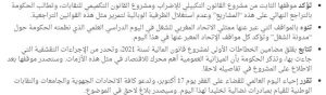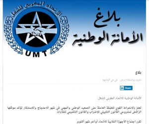 هذا وجدد الإتحاد التأكيد على موقفه من مشروع قانون الإٍضراب ومشروع قانون النقابات، داعيا الحكومة إلى “التراجع النهائي على هذه المشاريع وعدم استغلال الظرفية الوبائية لتمرير مثل هذه القوانين التراجعية”.