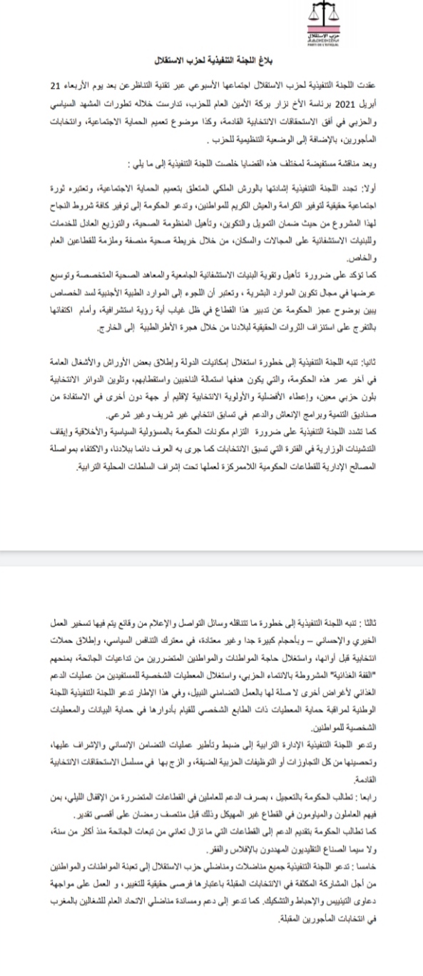 نبّهت اللجنة التنفيذية لحزب الاستقلال، إلى ما وصفته بـ”خطورة استغلال” إمكانيات الدولة وإطلاق بعض الأوراش والأشغال العامة في آخر عمر حكومة سعد الدين العثماني.