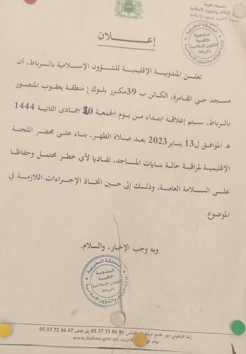 دأبت وزارة الأوقاف والشؤون الإسلامية في شخص مندوبياتها منذ مدة على إغلاق بعض مساجد المملكة سواء في البوادي أو المدن، بناء على محضر اللجن الإقليمية لمراقبة حالة بنايات المساجد، حفظا لأنفس المؤمنين المصلين، وعلى حد تعبيرهم وتعليلهم “تفاديا لأي خطر محتمل وحفظا على السلامة العامة”.