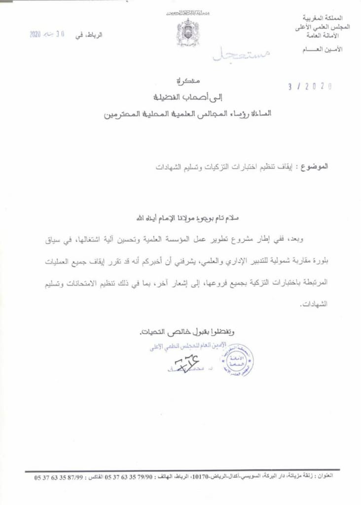 تداول نشطاء على مواقع التواصل الاجتماعي، صورة لرسالة من المجلس العلمي الأعلى موجهة إلى كافة رؤساء المجالس العلمية، تقضي بإيقاف تنظيم اختبارات التزكيات وتسليم الشهادات.
