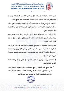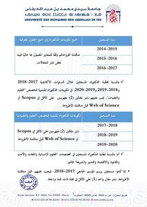 قررت جامعة سيدي محمد بن عبد الله بفاس، وجوب نشر كل طالب في سلك الدكتوراة بالجامعة، ما لا يقلّ عن مقالين مُفهرسين، قبل تحديد موعد المناقَشة، في قاعدتي البيانات البحثية والاقتباسات “سكوبس”، و”ويب أوف ساينس” .