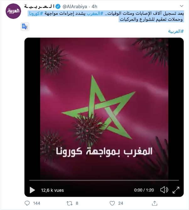 قامت قناة العربية السعودية، التي تبث من دولة الإمارات العربية المتحدة بنشر شريط تدعي فيه تسجيل آلاف الإصابات ومئات الوفيات في المغرب، وأنه شدد إجراءات مواجهة كورونا وحملات تعقيم للشوارع والمركبات، من أجل هذا.