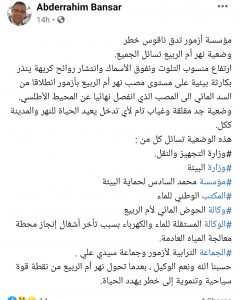ودعت التنسيقية إلى فتح مصب نهر أم الربيع وضرورة الإسراع بإخراج محطة تصفية المياه العادمة، وذلك بعد نفوق أسماك الواد وتلوث مياه النهر.