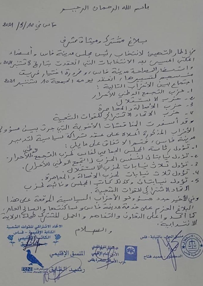 وحسب البلاغ المشترك الصادر عن الأحزاب والمذيل بتوقيع كلا من مسؤولي أحزاب التجمع الوطني للأحرار والأصالة والمعاصرة والاتحاد الاشتراكي والاستقلال، حيث تم الاتفاق على أن تؤول رئاسة المجلس إلى حزب التجمع الوطني للأحرار، بالإضافة إلى نيابتين.