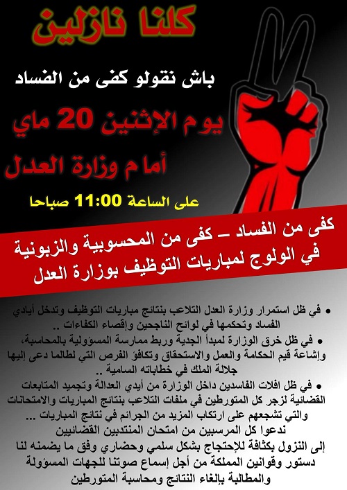دعا الراسبون في امتحان المنتدبين القضائيين إلى وقفة احتجاجية أمام وزارة العدل يوم الاثنين 20 ماي على الساعة 11:00 صباحا، تحت شعار “كلنا نازلين باش نقولو كفى من الفساد، كفى من المحسوبية والزبونية في الولولج لمباريات التوظيف بوزارة العدل“.