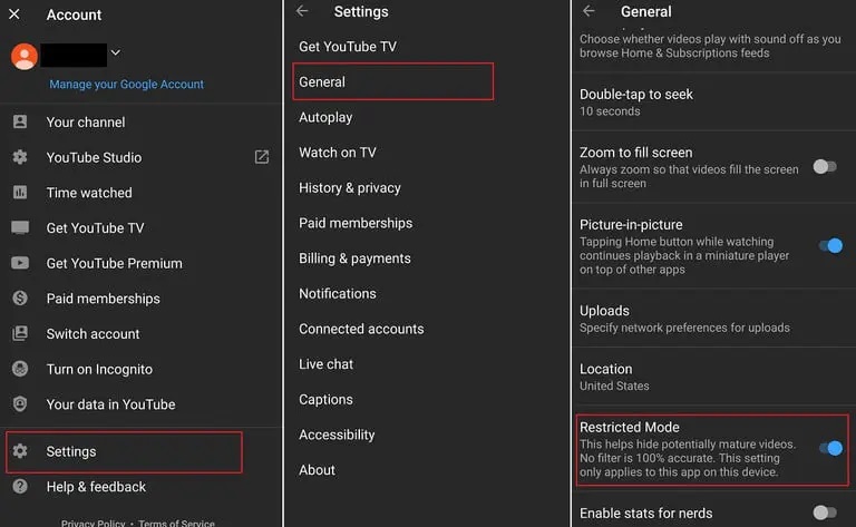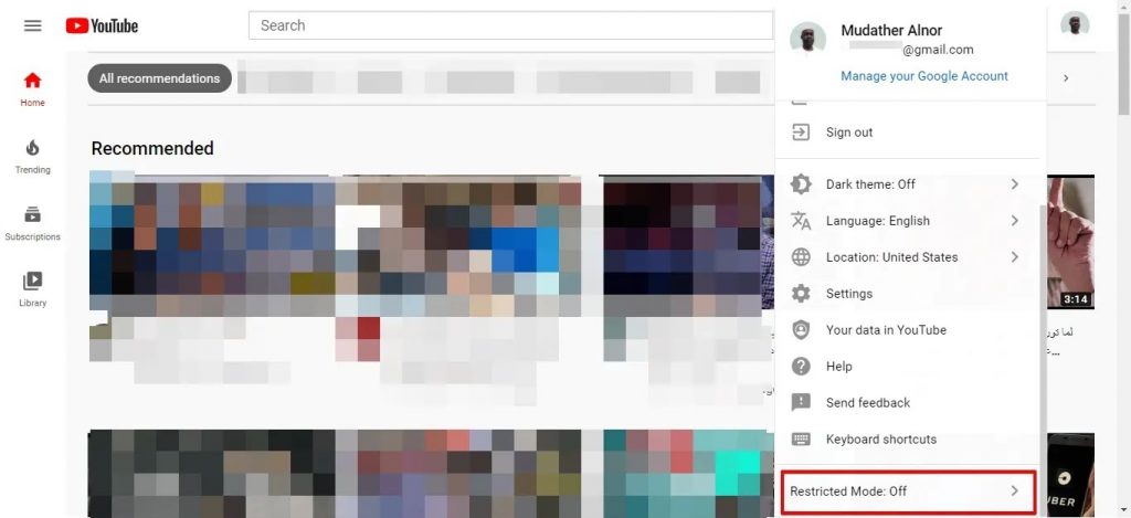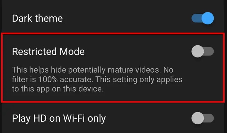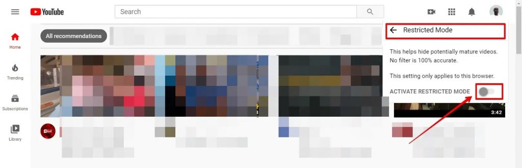 فعّل (وضع تقييد المحتوى) Restricted Mode من خلال الضغط على زر التبديل المجاور له.