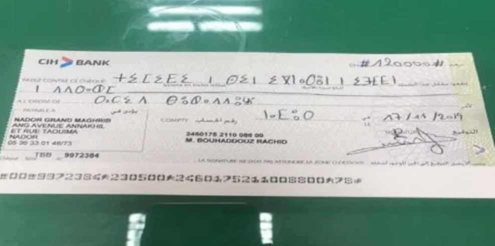 في سابقة من نوعها قامت مؤسسة بنكية بصرف شيك مكتوب باللغة الأمازيغية، بقيمة 120 ألف درهم.