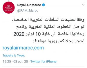 وقالت الشركة، على حسابها بموقع تويتر، أنه تبعا لقرار الحكومة المغربية، بتمديد حالة الطوارئ الصحية، فإنها ستمدد برنامجها للرحلات الاستثنائية، إلى غاية شهر نونبر المقبل.