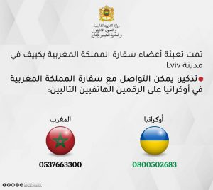 وذكرت ذات الصفحة بأنه “يمكن التواصل مع سفارة المملكة المغربية في أوكرانيا على الرقمين الهاتفيين التاليين: