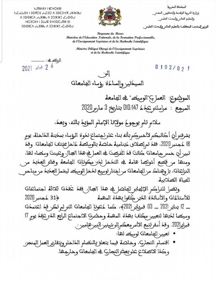 راسل وزارة التربية الوطنية والتعليم العالي، اليوم الخميس، رؤساء الجامعات المغربية، لتعيين وسيط لكل جامعة، من أجل التدخل بين أطراف أي نزاع داخل الفضاء الجامعي.