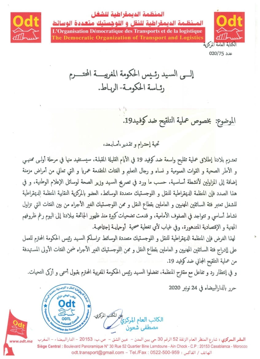 دعت المنظمة الديمقراطية للنقل واللوجستيك متعددة الوسائط، رئيس الحكومة سعد الدين العثماني إلى إدراج السائقين المهنيين والعاملين بقطاع النقل ومهن اللوجستيك غير الأجراء ضمن الفئات الأولى المستهدفة من لقاح كورونا.