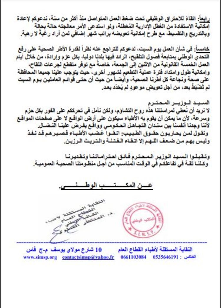 طالبت النقابة المستقلة لأطباء القطاع العام وزير الصحة، خالد ايت الطالب، بالتوقف عن العمل بمستشفيات المملكة أيام السبت، ليتمكنوا من التفرغ لإنجاح عملية التلقيح الوطنية ضد فيروس كورونا.