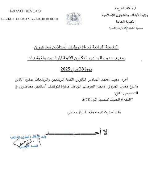 أعلنت وزارة الأوقاف والشؤون الإسلامية عبر موقعها، أن “معهد محمد السادس لتكوين الأئمة المرشدين والمرشدات أجرى بمقره الكائن بشارع محمد الجزولي، مدينة العرفان، الرباط، مباراة لتوظيف أستاذين محاضرين دورة 28 ماي 2025، في التخصص التالي: الفقه أو الحديث (منصبين اثنين)”، مردفة “وقد أسفرت النتيجة النهائية لهذه المباراة عما يلي: لا أحد“.