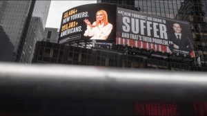 هددت إيفانكا ابنة الرئيس الأمريكي دونالد ترامب وصهره جاريد كوشنر، وكلاهما من كبار المساعدين بالبيت الأبيض، بمقاضاة مجموعة من الجمهوريين المناهضين لترامب لنشرهم إعلانات على لوحة إعلانية في ساحة تايمز سكوير بمدينة نيويورك تربطهم بحوالي 225 ألف حالة وفاة بسبب فيروس كورونا في البلاد.
