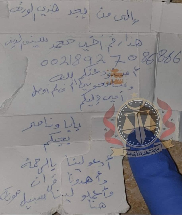 “إلى من يجد هذه الورقة، هذا رقم أخي، استودعتكم الله، وسامحوني أني لم أوصل أمي إليكم، بابا وناصر بحبكم، ادعو لينا بالرحمة وأهدونا قرآن، واعملو لينا سبيل موته هنا”.