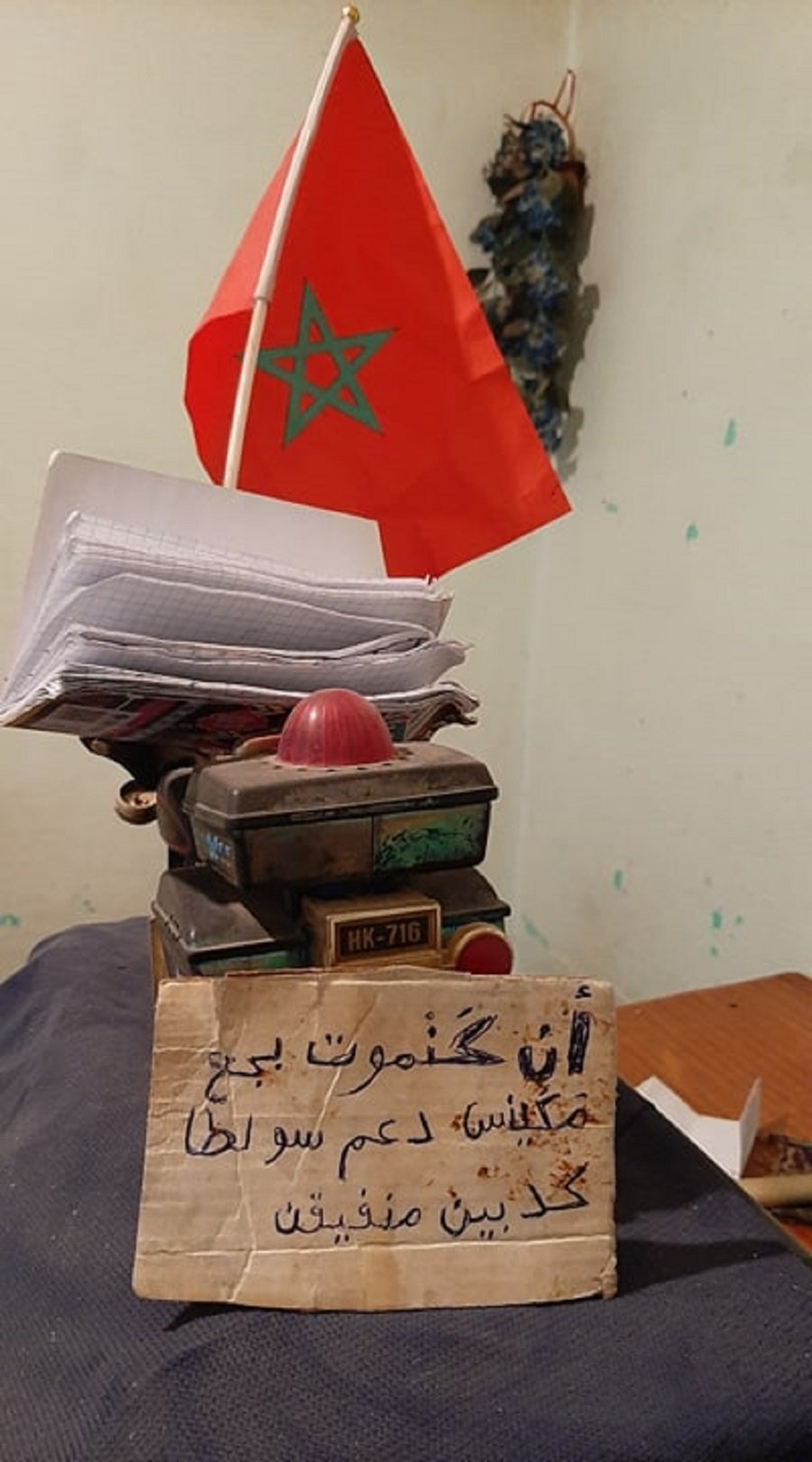 وحسب الصورة المتداولة، ترك الرجل رسالته إلى جانب العلم المغربي وبعض الكتب وأشياء القديمة.