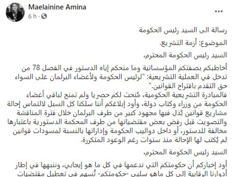 راسلت النائبة البرلمانية عن حزب العدالة والتنمية “آمنة ماء العينين”  رئيس الحكومة سعد الدين العثماني حول ما أسمته “أزمة التشريع” معتبرة أن مسؤوليته المؤسساتية وما منحه الفصل 78 من الدستور، كما تساءلت عن عدم إحالة الحكمومة لمشروع القانون التنظيمي للدفع بعدم دستورية قانون الفصلين 133 و 134.