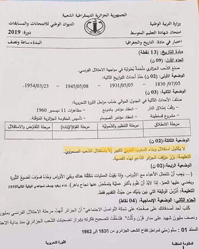 حيث طرحت وزارة التربية الوطنية الجزائرية خلال الامتحان المذكور على التلاميذ سؤالا جاء فيه “لا يكمل استقلال وبناء المغرب العربي الكبير إلا باستقلال الشعب الصحراوي. تعليمة: برر موقف الجزائر الداعم لهذه القضة“.