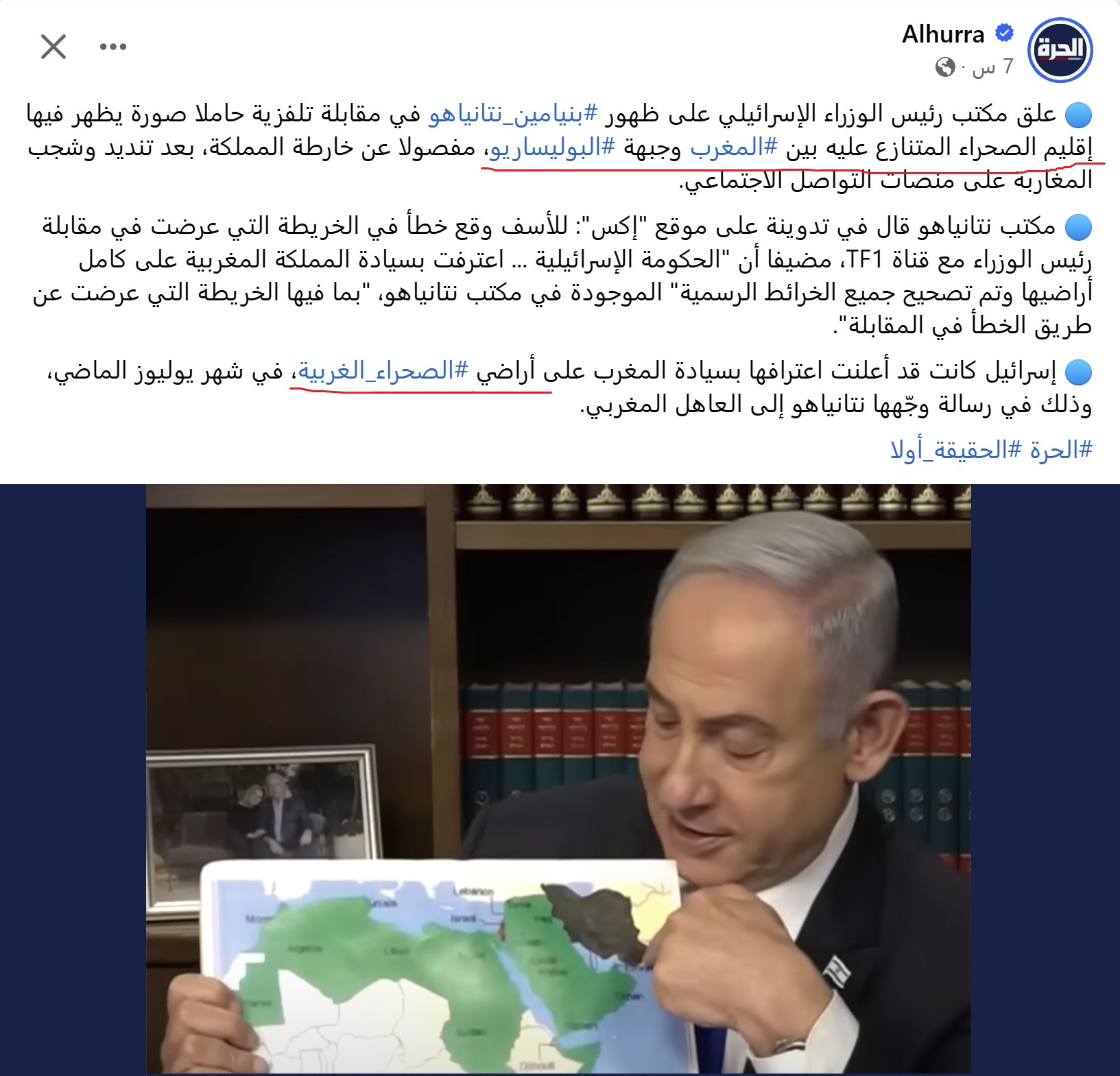 في الوقت الذي يتواصل فيه غضب المغاربة العارم وتنديدهم الشديد بما أقدم عليه رئيس الوزارء الصهيوني، بنيامين نتنياهو، من تطاول بشع على وحدة المملكة الترابية، عن سبق إصرار وترصد، أطلت علينا قناة الحرة الأمريكية، لسان أمريكا الديبلوماسي باللغة العربية، بخبر يضج بألفاظ دلالية لا تبشر بخير بشأن موقف الولايات المتحدة الأمريكية الحقيقي من قضية الصحراء المغربية.