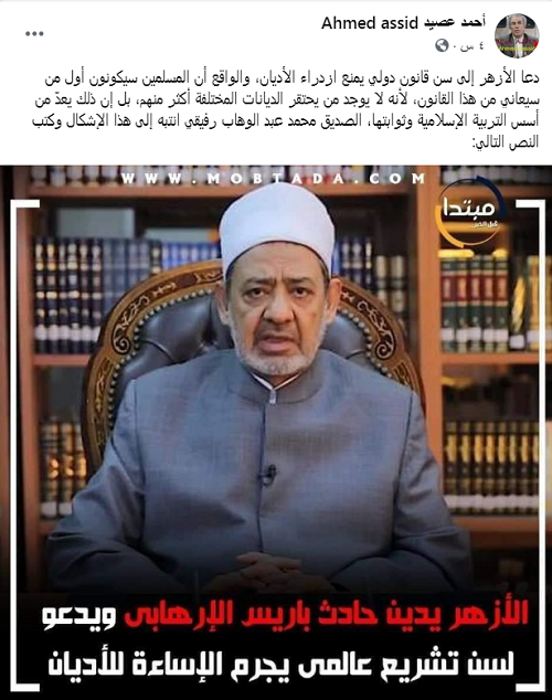 وجاء كلامه الذي أثار كثير من المتتبعين بعد أن دعا شيخ الأزهر إلى سن قانون دولي يمنع ازدراء الأديان، فكتب عصيد على صفحته بالفيسبوك “الواقع أن المسلمين سيكونون أول من سيعاني من هذا القانون، لأنه لا يوجد من يحتقر الديانات المختلفة أكثر منهم، بل إن ذلك يعدّ من أسس التربية الإسلامية وثوابتها”، ليحيل بعد ذلك على تدوينة لمن سماه “الصديق محمد عبد الوهاب رفيقي”.