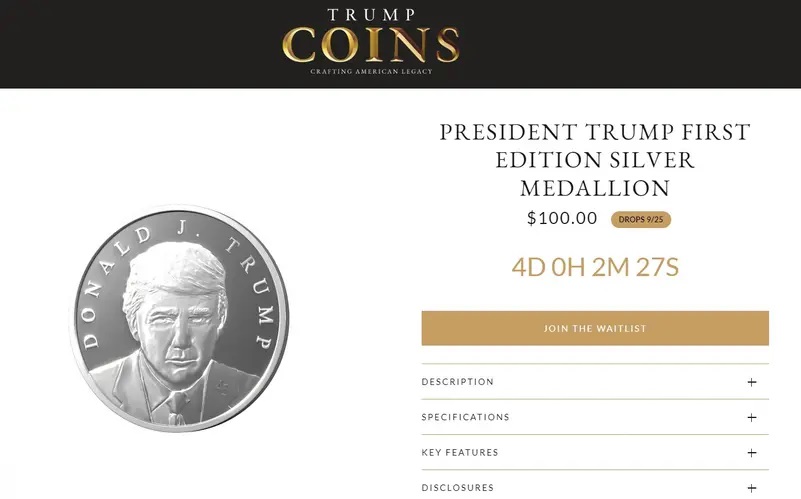 وأضاف بأن ميدالية الرئيس دونالد جيه ترامب الفضية ستتوفر من الإصدار الأول “اعتبارًا من يوم الأربعاء 25 سبتمبر 2024”.