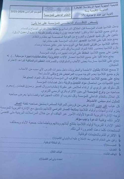 . كل سلوك غير تربوي أو ارتداء ملابس غير مقبولة (جلباب / سروال قصير وممزق / قبعات …) يحرم صاحبه من ولوج المؤسسة إلى حين الالتزام بالزي الرسمي التربوي.