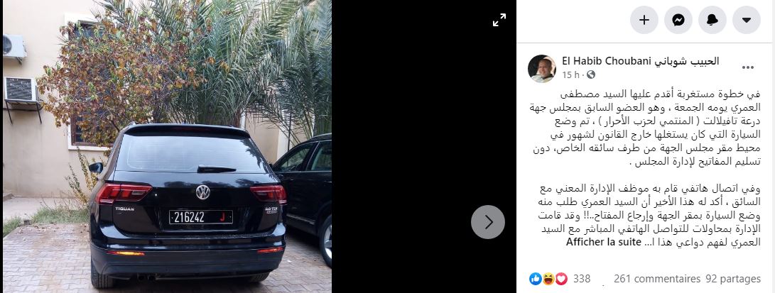 وأكد الحبيب الشوباني في نهاية تدوينته التي أرفقها بصورة للسيارة المعنية، أنه “بناء على ما سبق، قامت الإدارة بإجراء المعاينات القانونية التي يفرضها هذا السلوك المخالف للقانون، والصادر عن عضو سابق، لم تعد تربطه أي علاقة قانونية بمجلس الجهة ولا بممتلكاته”.