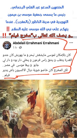 وعلق عزيز هناوي، الكاتب العام للمرصد المغربي لمناهضة التطبيع، على التدوينة بقوله: “المتصهين المدعو عبد العلي الرحماني.. رئيس ما يسمى جمعية موسى بن ميمون التهويدية في مدينة الناظور (بالمغرب).. عندما يتهكم على نبي الله موسى عليه السلام.. ويصف الله تعالى بـ”مخرج فيلم”، على حد قول هناوي في تدوينة على حسابه ب”فيسبوك”.