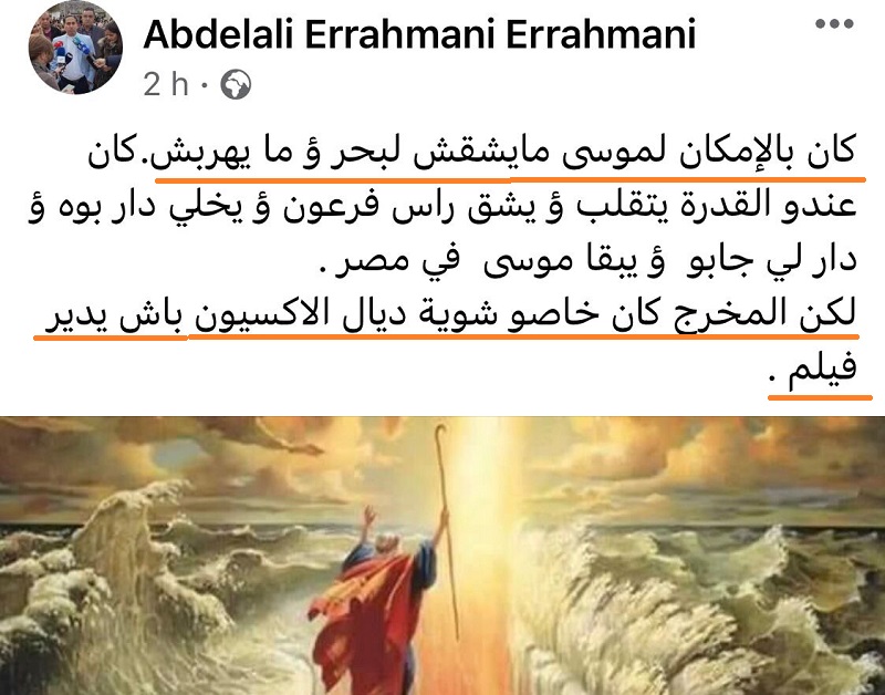 في موقف مثير ومستفز، كتب رئيس جمعية “موسى بن ميمون” بمدينة الناظور تدوينة، على حسابه بـ”فيسبوك”، جاء فيها: “كان بالإمكان لموسى مايشقش لبحر ؤ ما يهربش. كان عندو القدرة يتقلب ؤ يشق راس فرعون ؤ يخلي دار بوه ؤ دار لي جابو ؤ يبقا موسى في مصر. لكن المخرج كان خاصو شوية ديال الاكسيون باش يدير فيلم”.