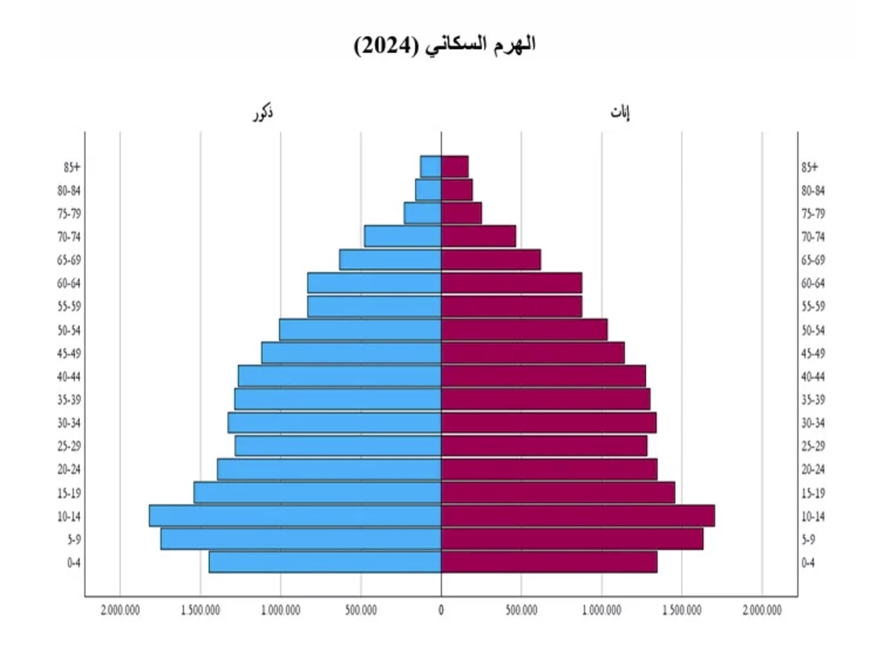 كما أن الذين يتجاوزون 60 سنة انتقلت نسبتهم من 8 في المائة سنة 2004، إلى 9,4 في المائة سنة 2014(3,2 ملايين نسمة)، وقفزت إلى 13,8 في المائة سنة 2024 (5 ملايين نسمة)، أي بمعدل نمو سنوي يقدر بـ4,6 في المائة، متجاوزا معدل النمو الإجمالي للسكان (0,85 في المائة).