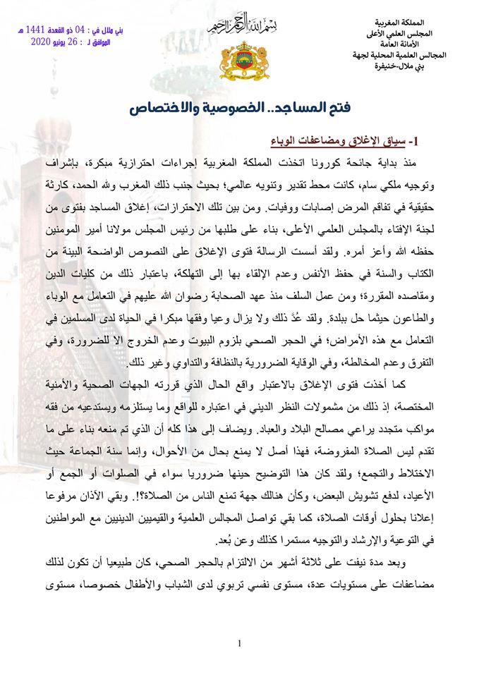 أصدرت المجالس العلمية المحلية لجهة بني ملال خنيفرة ورقة حول إغلاق المساجد في ظل جائحة كورونا عنونتها بـ”فتح المساجد الخصوصية والاختصاص”.